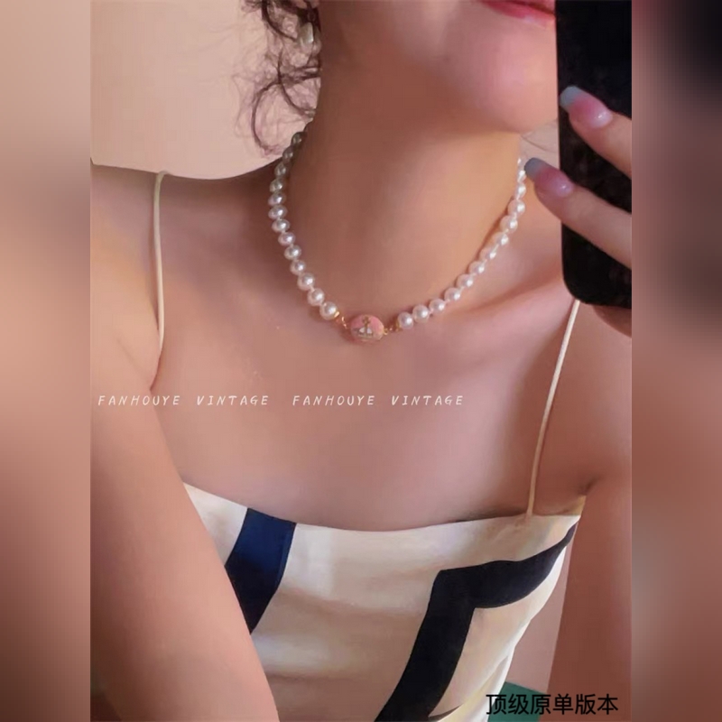 Collar con colgante de perlas rosas de Vivienne Westwood, estilo minimalista.