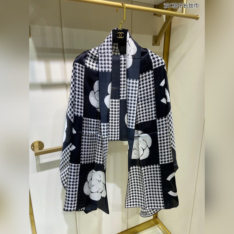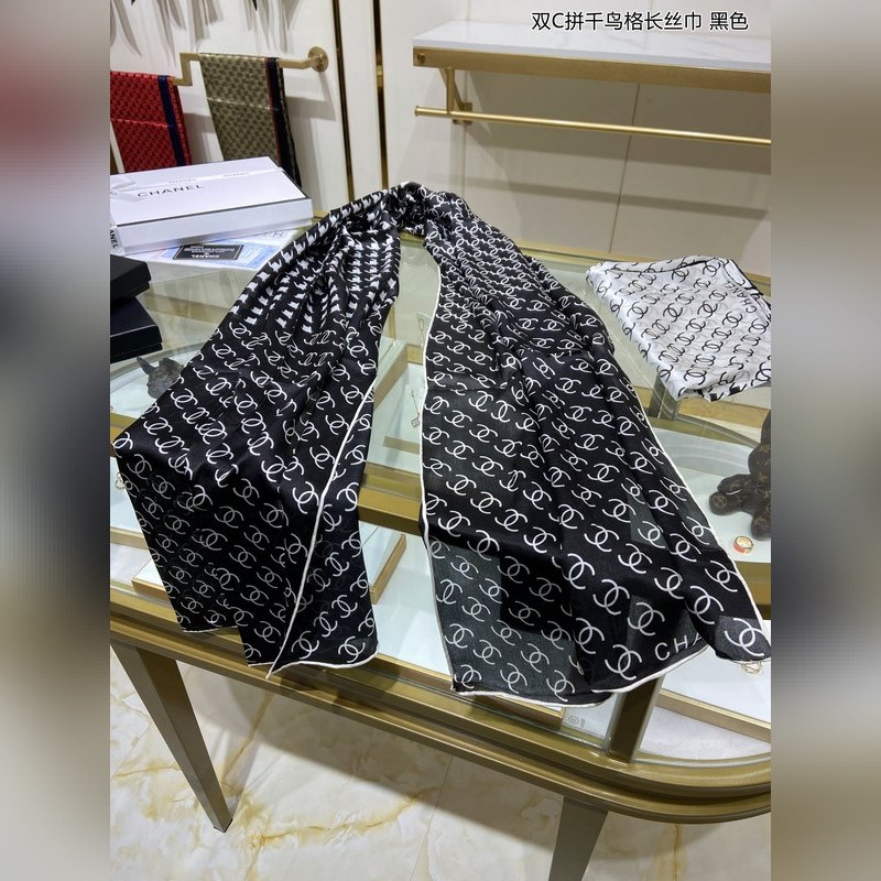 Pañuelo largo de seda con estampado de pata de gallo de CHANEL, 100% seda morera de primera calidad