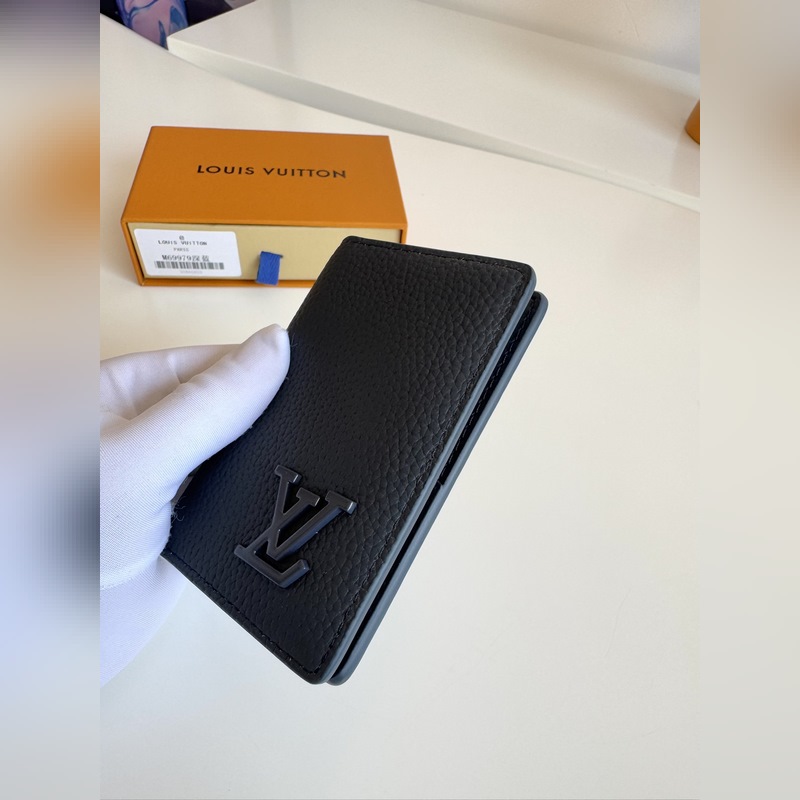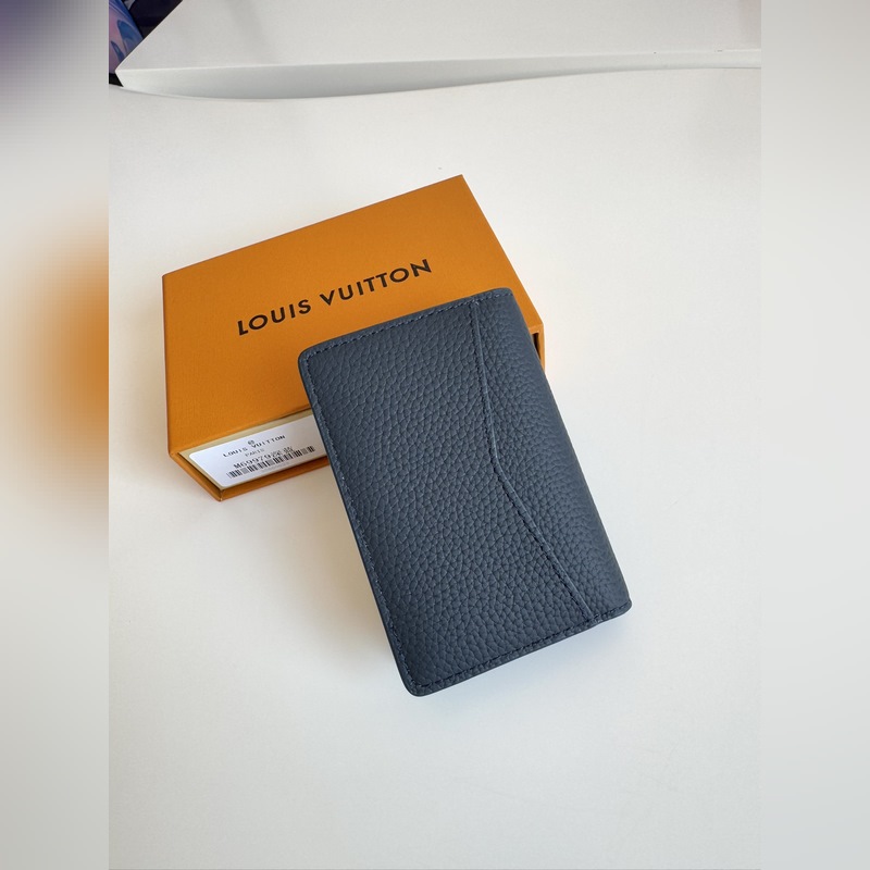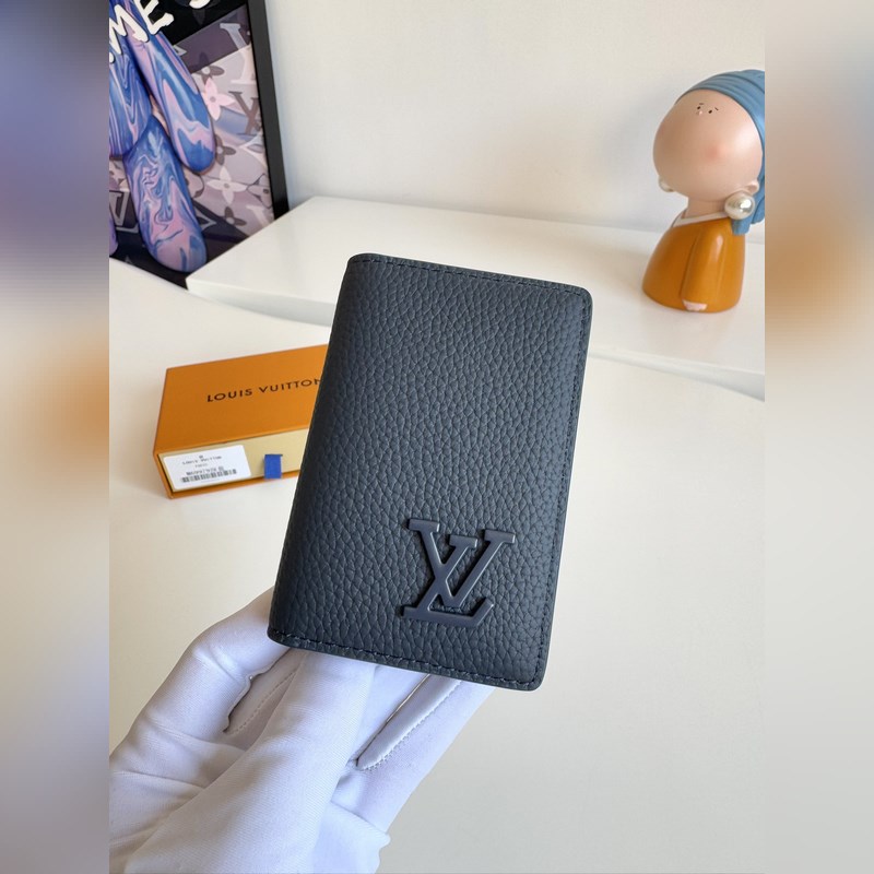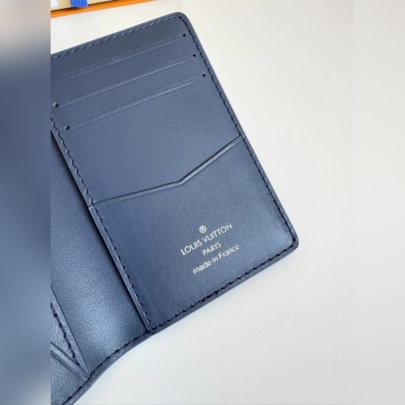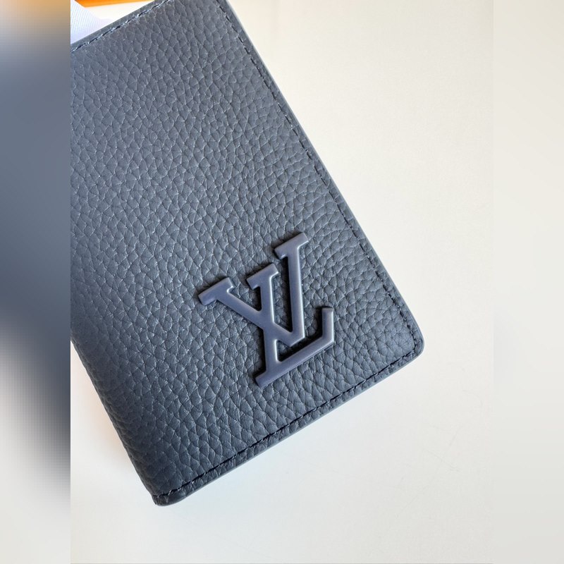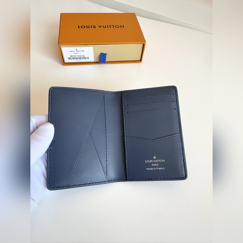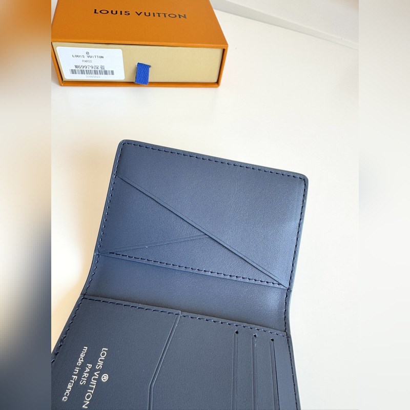Imagen original M69979 azul oscuro exclusiva de la nueva cartera de bolsillo LV Aerogram. La piel de vaca seleccionada es tan suave como los antiguos membretes de aviación. Las discretas letras metálicas LV marcan la identidad de la marca. Cuenta con compartimentos y ranuras para tarjetas, logrando una fusión de elegancia y funcionalidad. Combina con cualquier bolso de la serie LV Aerogram. Tamaño: 11 × 8 cm.