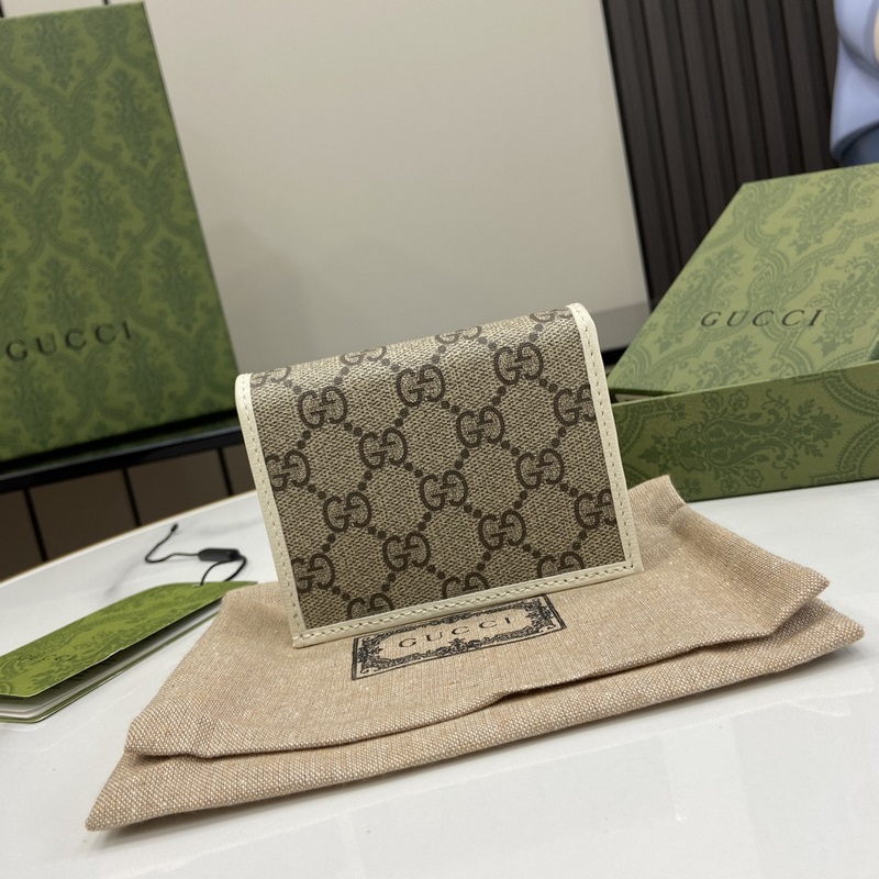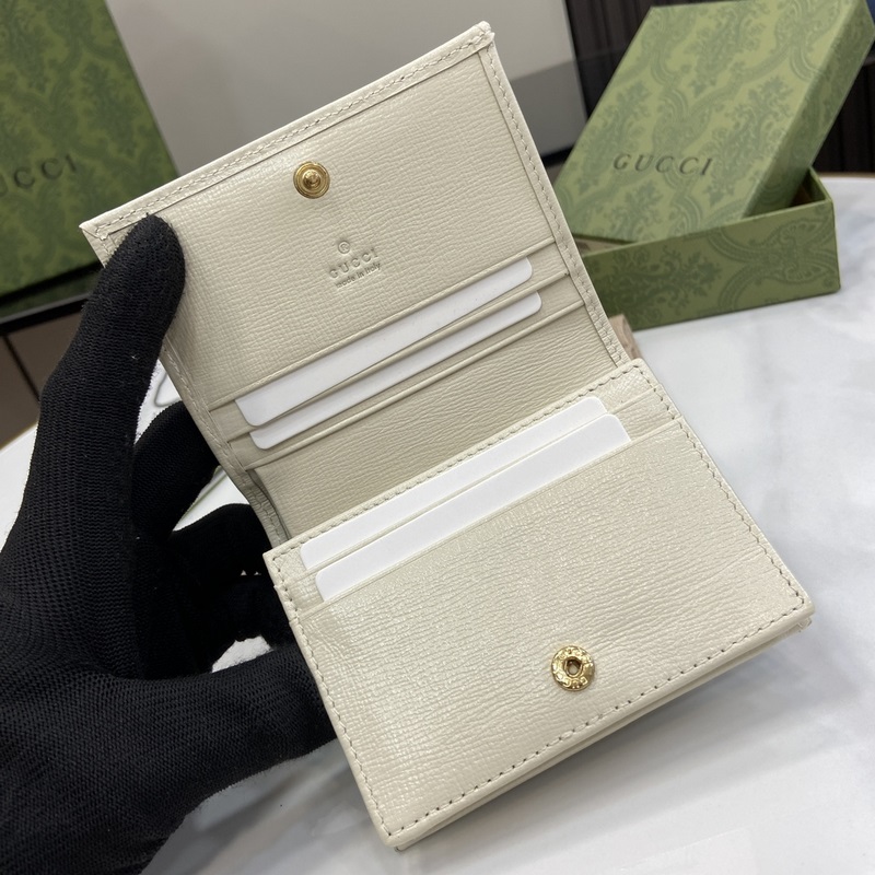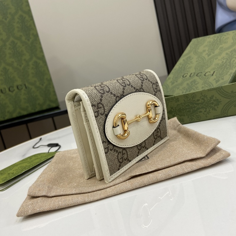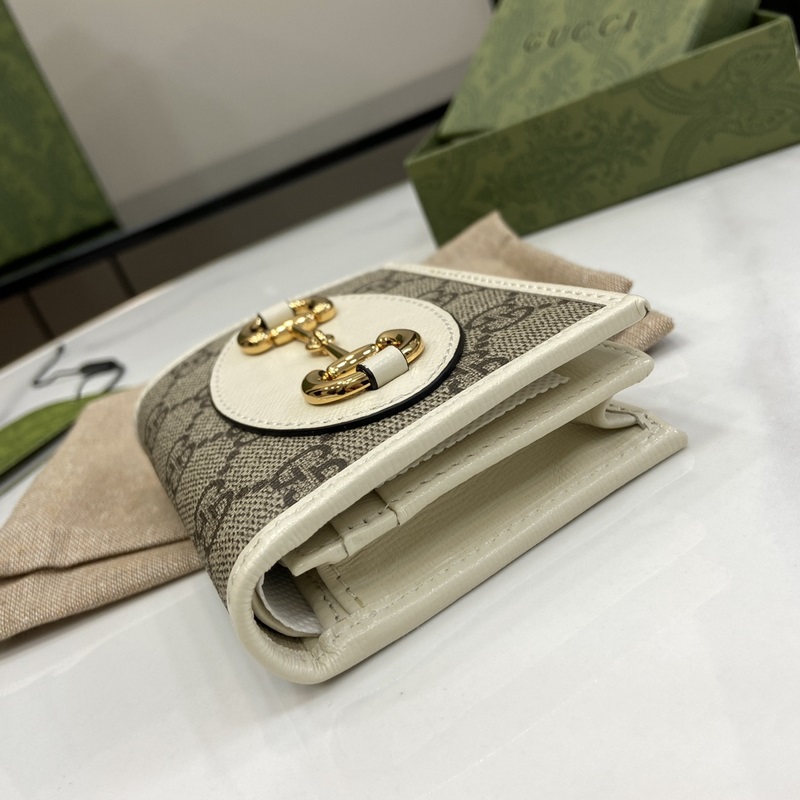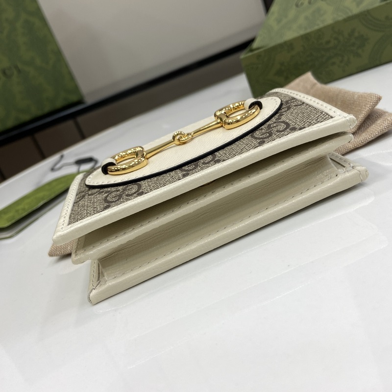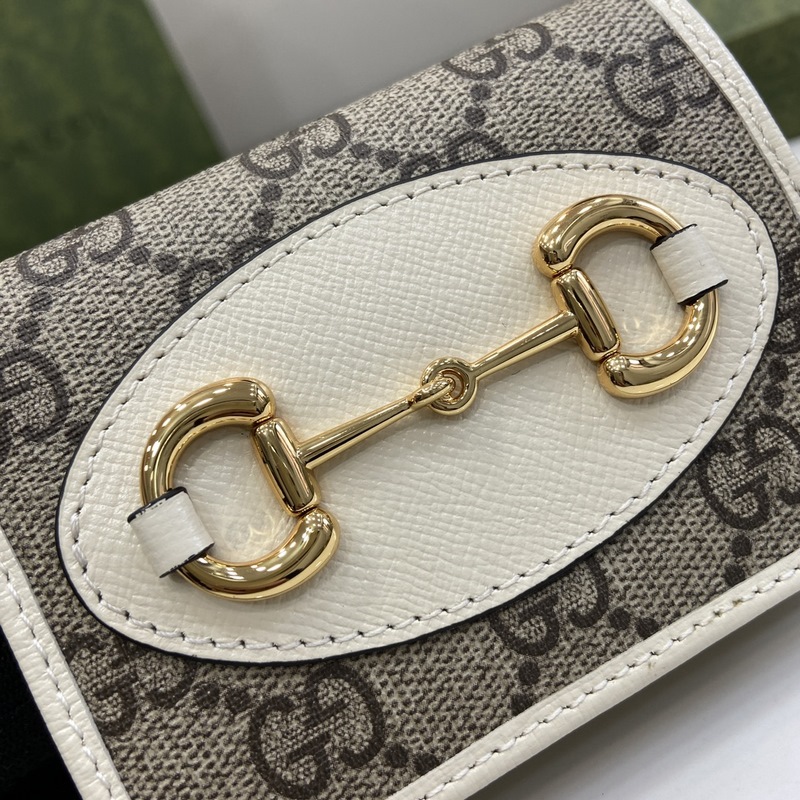 Tarjetero Gucci Horsebit 1955. Para la colección Pre-Otoño 2020, el tarjetero Gucci Horsebit 1955 está disponible en lona GG Supreme y piel blanca. La serie presenta un diseño de doble anilla y tira larga, acorde con los bolsos, un detalle inspirado en los orígenes ecuestres de la marca, un clásico de la herencia de Gucci y uno de sus símbolos más representativos. Lona GG Supreme beige/ébano, detalles en piel blanca, herrajes dorados, forro de viscosa, detalles de horsebit, cinco compartimentos para tarjetas, compartimento para billetes, bolsillo interior con cremallera y cierre a presión.