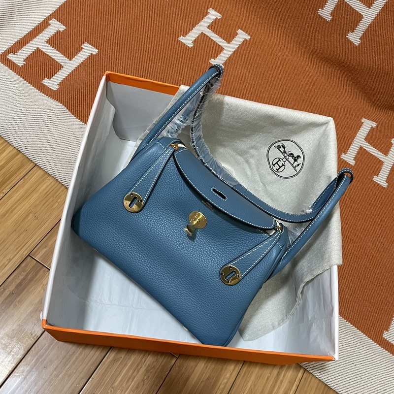 Réplica del bolso Hermès Lindy Tote, piel TC importada, azul vaquero, dorado y herrajes plateados.