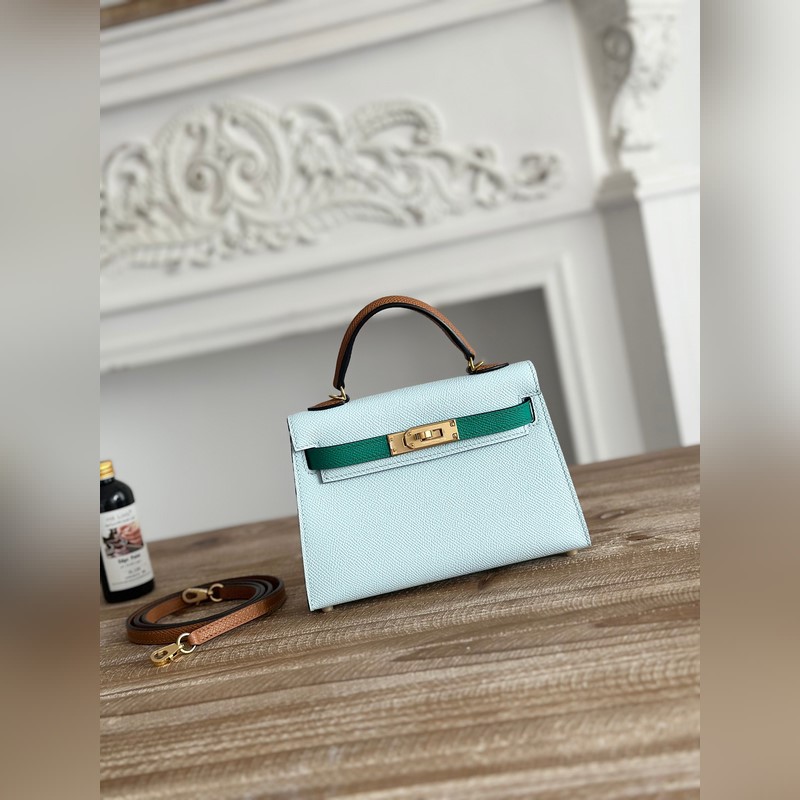 Kelly II Mini Epsom Leather en azul brumoso, verde rey y marrón dorado con herrajes dorados