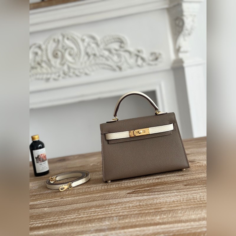 Kelly II Mini Epsom Leather en gris elefante y blanco leche con herrajes dorados