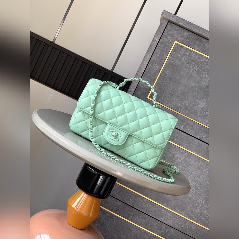 Réplica del bolso mini con solapa de Chanel en piel de cordero verde con metal brillante 25C