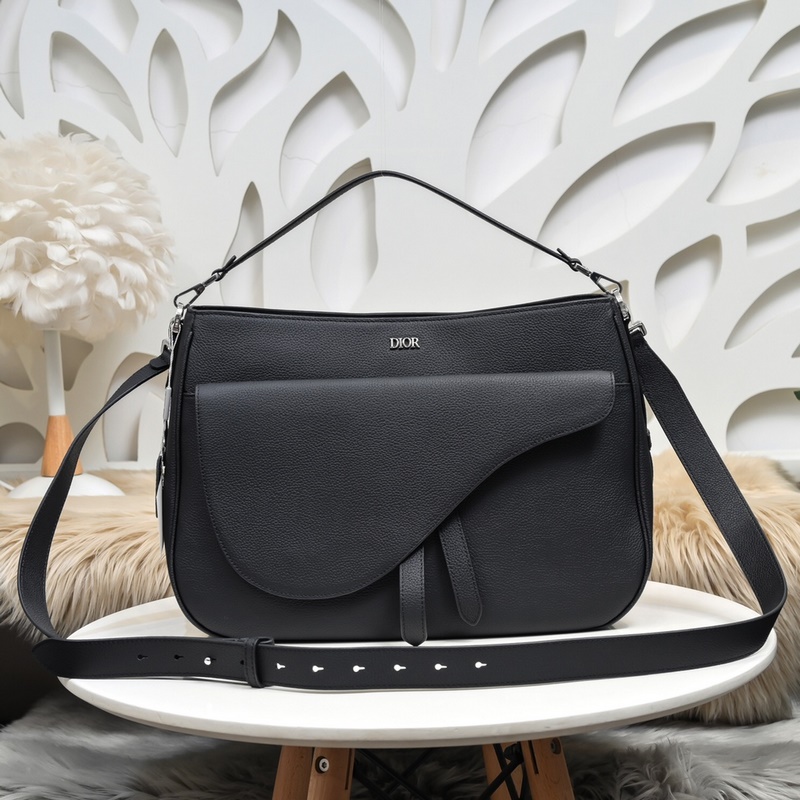 Lujoso bolso de cuero negro granulado tipo sillín con un diseño icónico.